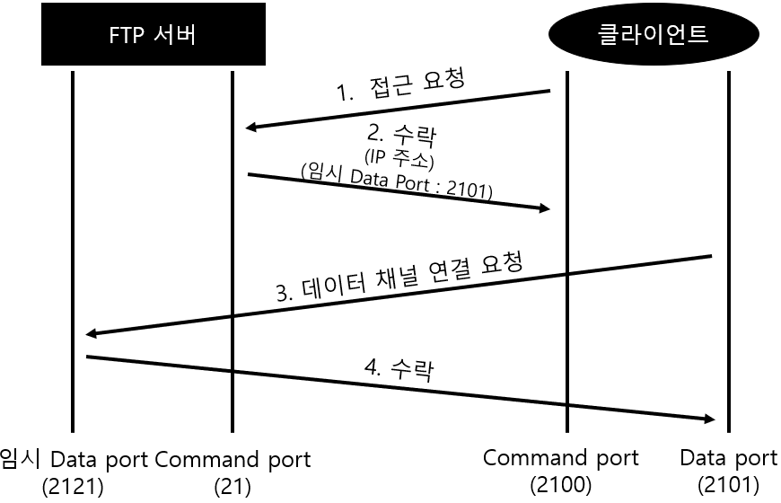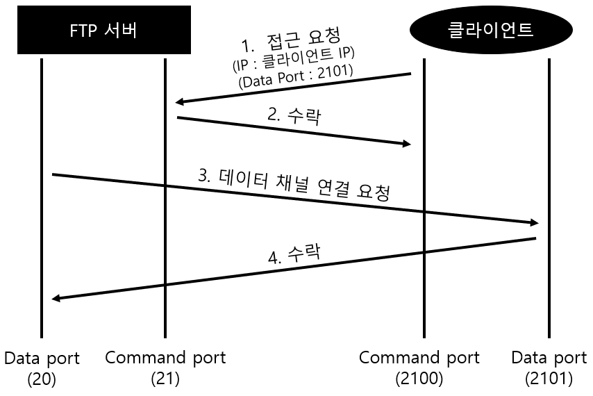 1. 클라이언트가 FTP서버로 접근을 요청함과 동시에 서버가 접속해야 할 클라이언트의 IP와 Data Port를 같이 보내줌.