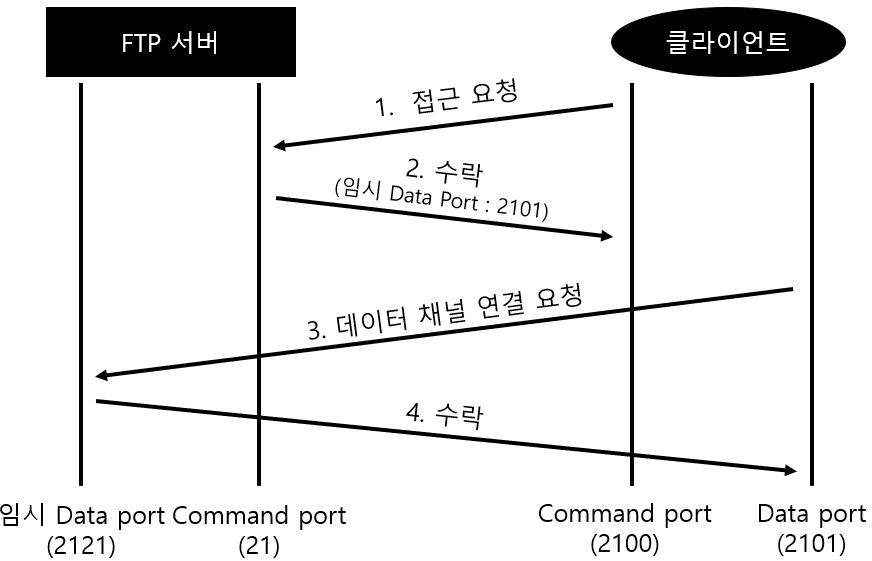 FTP 서버가 클라이언트에 자신의 데이터 채널의 정보를 알려주어 클라이언트 -> 서버로 데이터 채널의 연결을